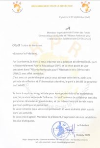 « C’est avec un profond regret que je vous adresse cette lettre. Après une période de réflexion et d’observation attentive, le parti a décidé de se retirer de L’ANAD », a-t-il écrit avant de dire que : « Je tiens à exprimer ma gratitude pour les opportunités et les expériences que j’ai pu vivre au sein de l’alliance. J’ai eu l’honneur de collaborer avec des personnes dévouées et passionnées, et ces interactions ont enrichi notre parcours politique et personnel ».