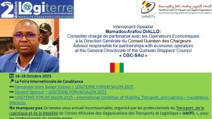 Conakry, 22 octobre 2025-Le Conseiller chargé du Partenariat auprès des Opérateurs Économiques à la Direction Générale du Conseil Guinéen des Chargeurs – Service d’Appui aux Usagers (CGC-SAU), Mamadou Arafou Diallo, a reçu une invitation officielle pour participer à la deuxième édition du Forum-Salon International de la Mobilité, du Transport et de la Logistique (LOGITERRE 2025), prévue du 16 au 18 octobre 2025 à la Foire Internationale de Casablanca (AMDIE), au Royaume du Maroc.